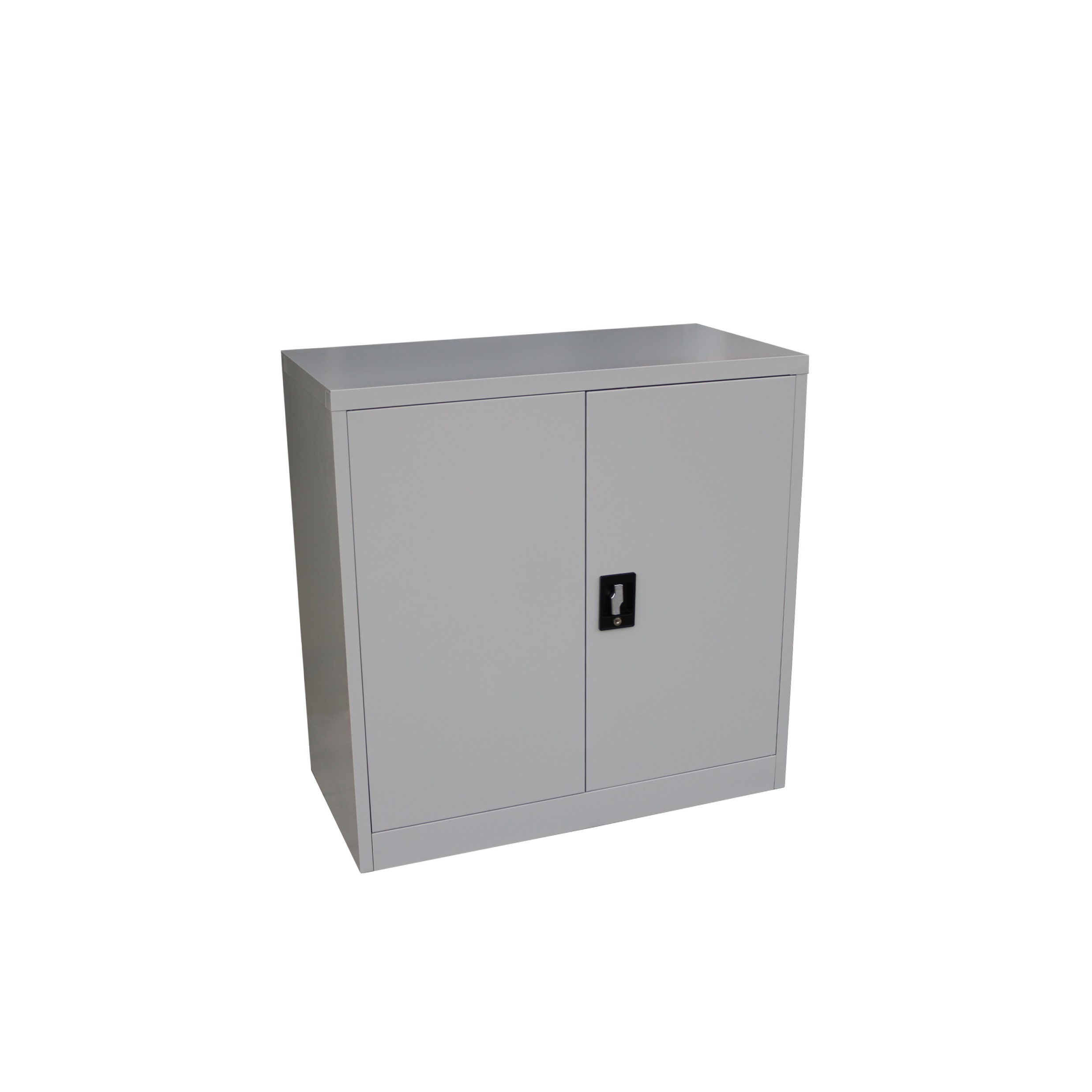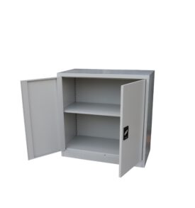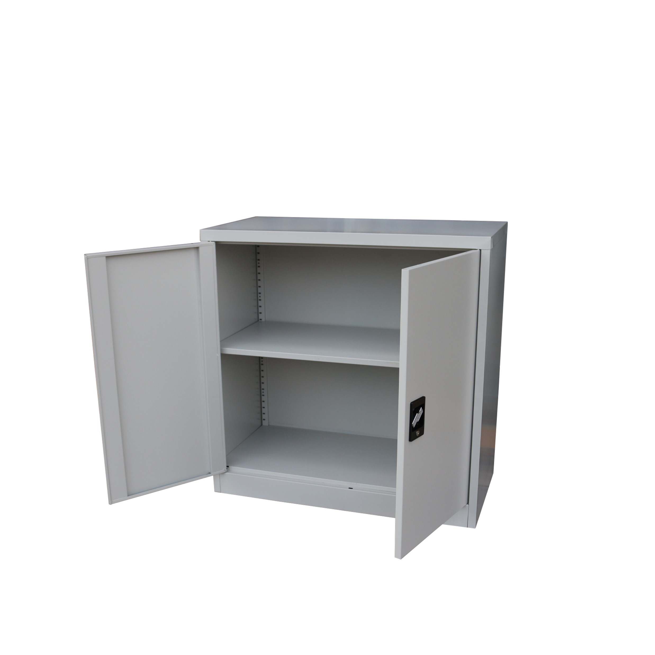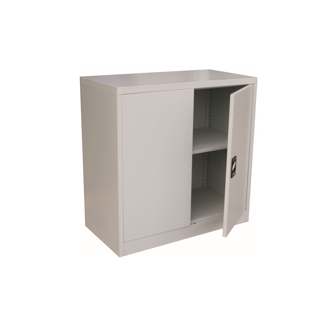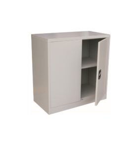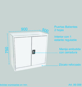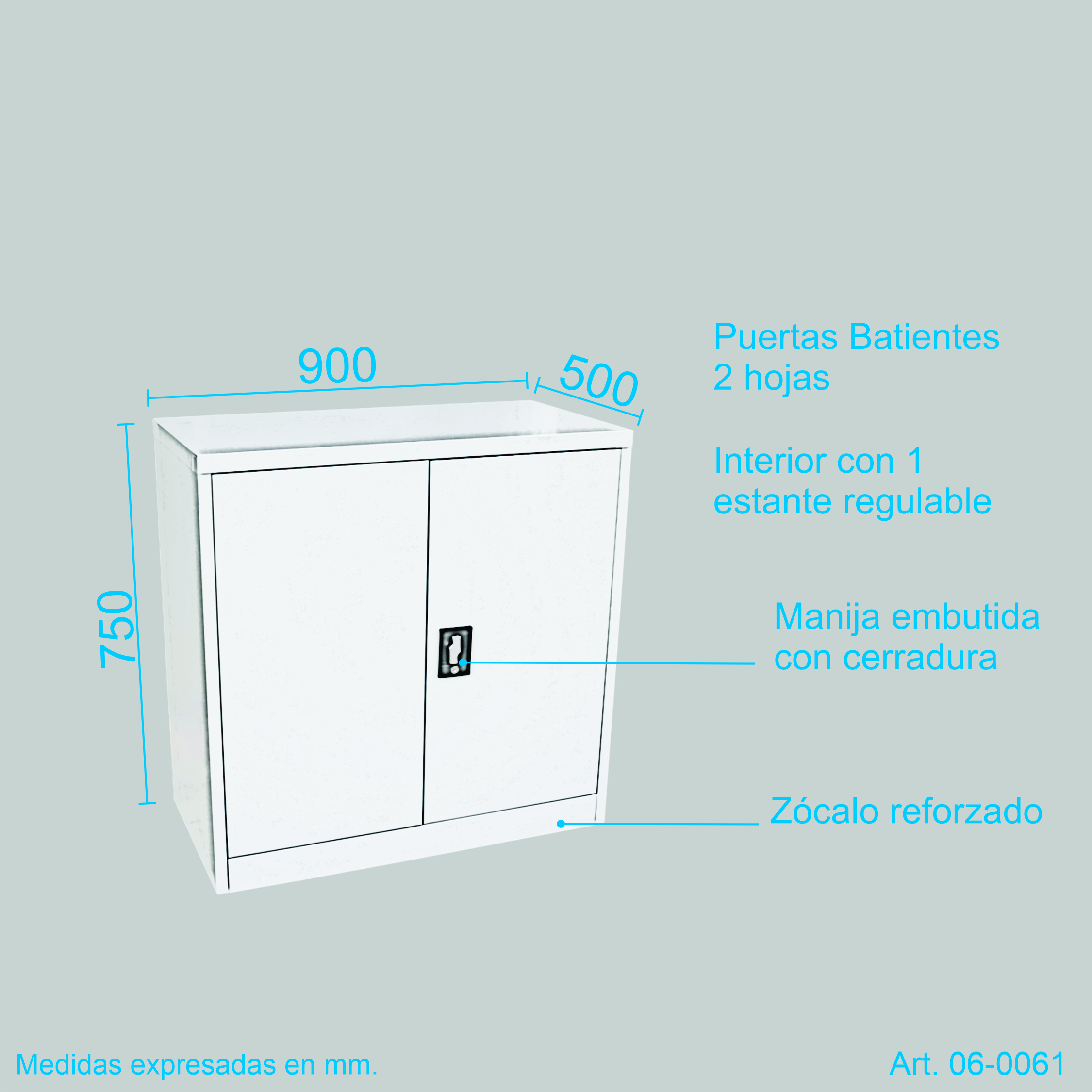 Armario Metálico Bajo de 2 Puertas Batientes, con 1 estante interno regulable por cremallera lateral.