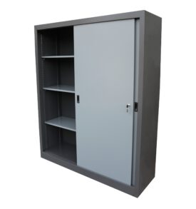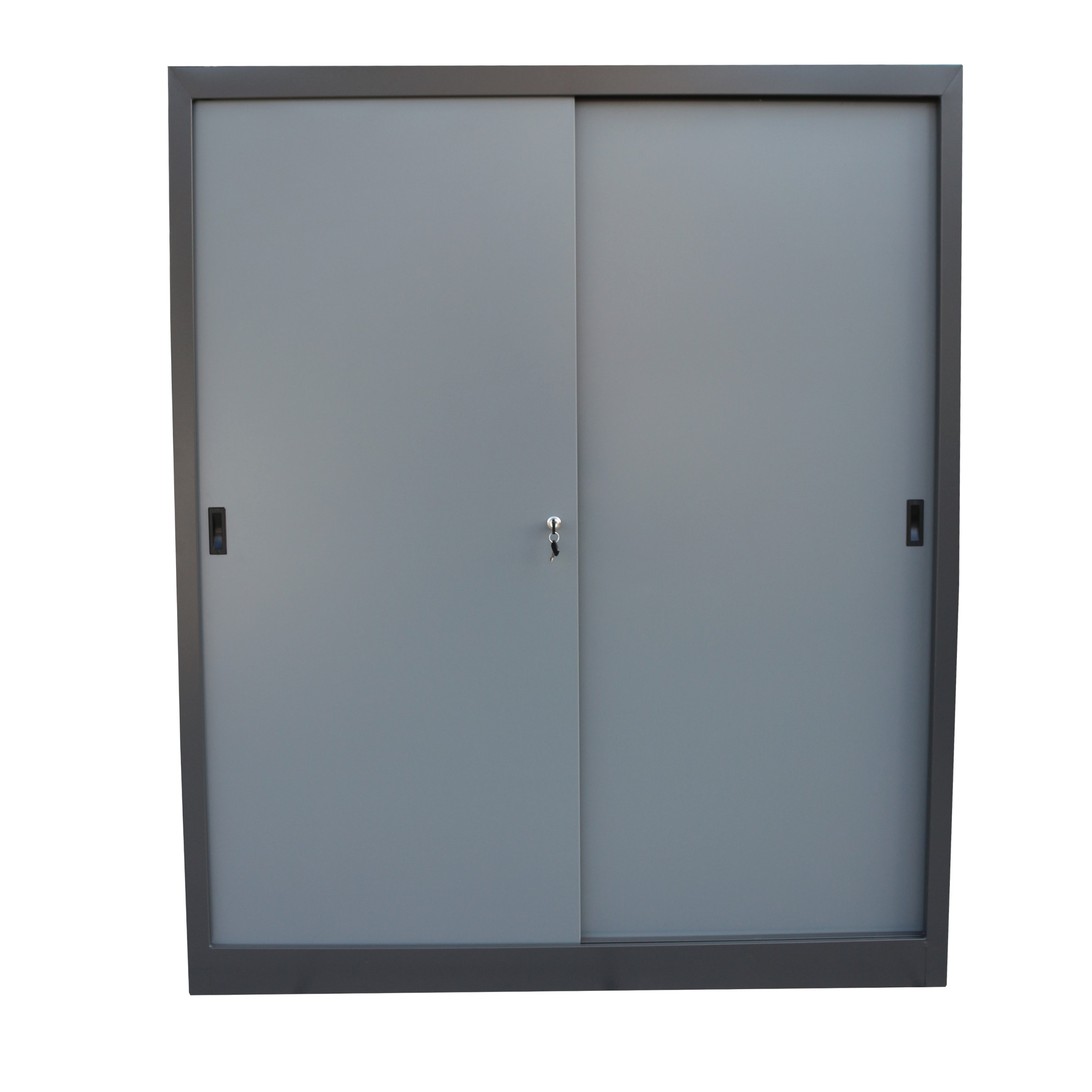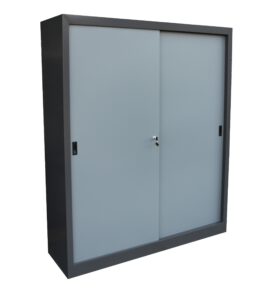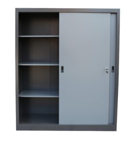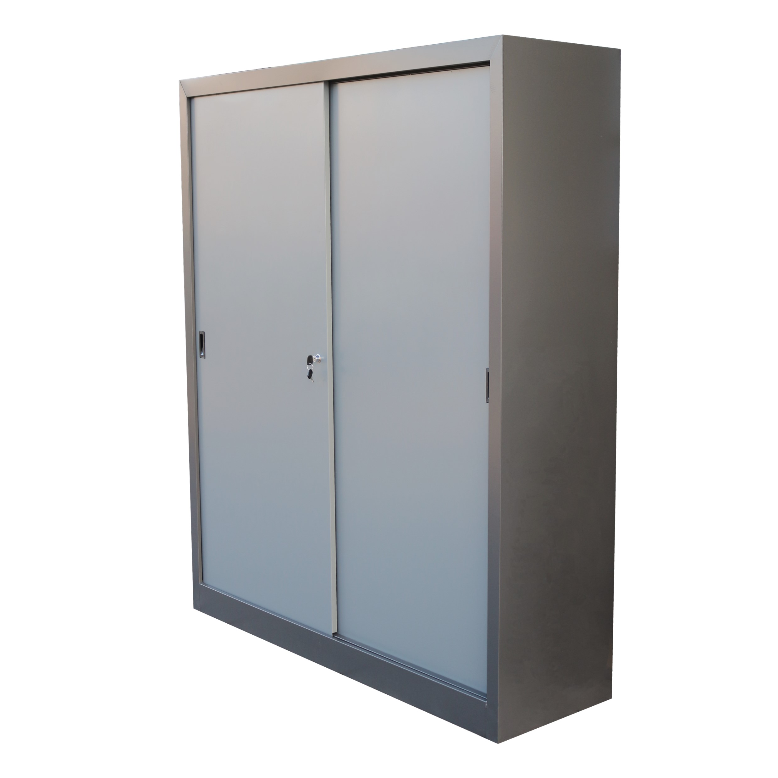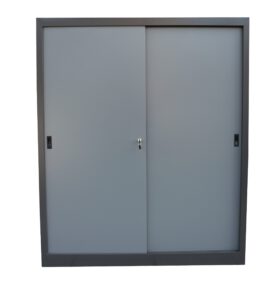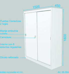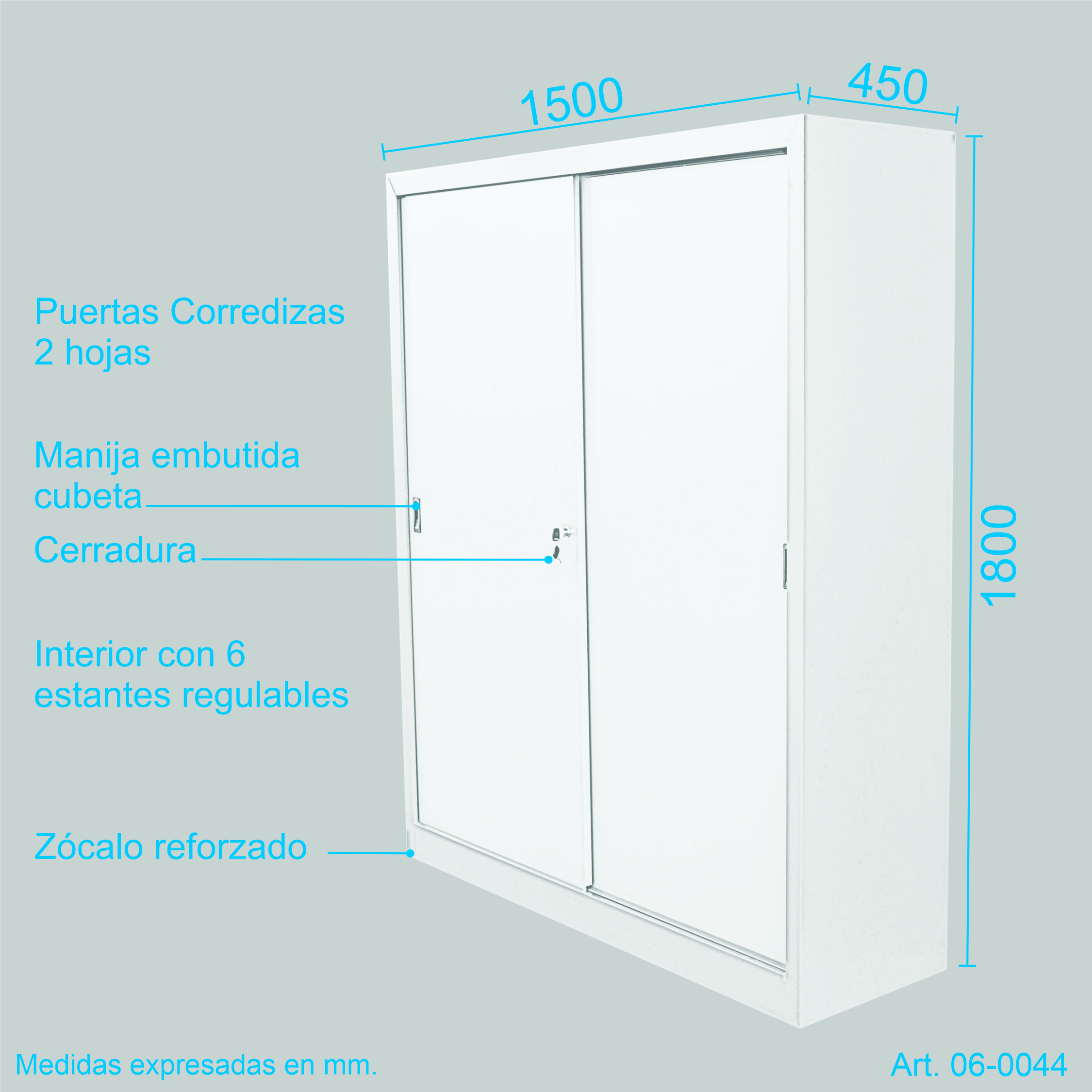 Armario Metálico de 2 Puertas Corredizas, con tabique divisor interno vertical y 6 estantes internos regulables por cremallera lateral (3 de cada lado).