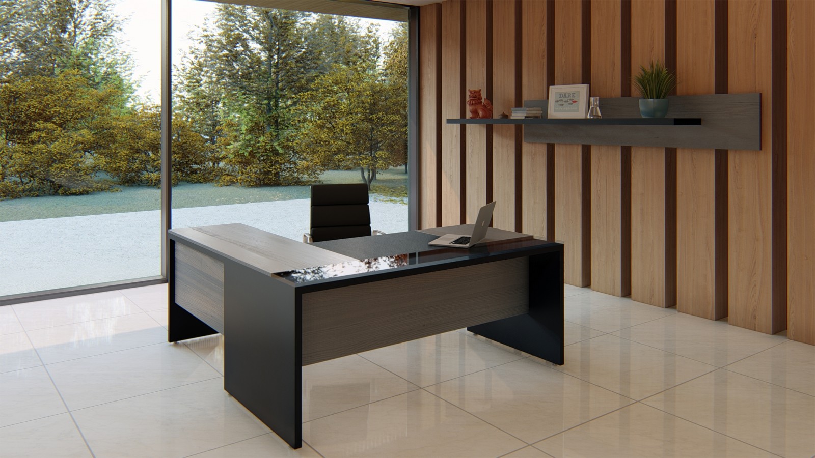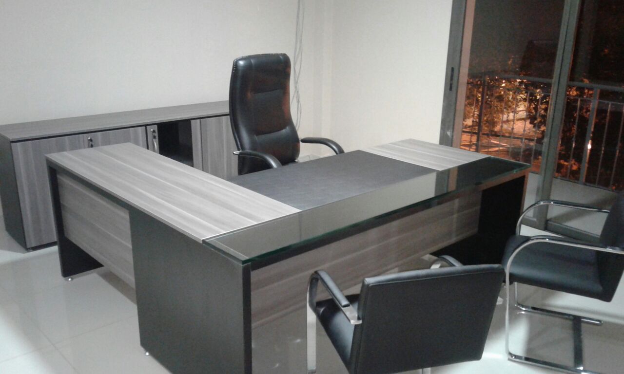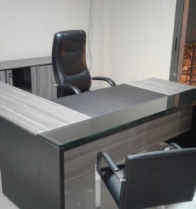 Escritorio Gerencial en L linea Futura de 1600x1850mm con extensión lateral. Tapa de 850mm de profundidad de melamina con eco-cuero y frente de Vidrio 18mm.