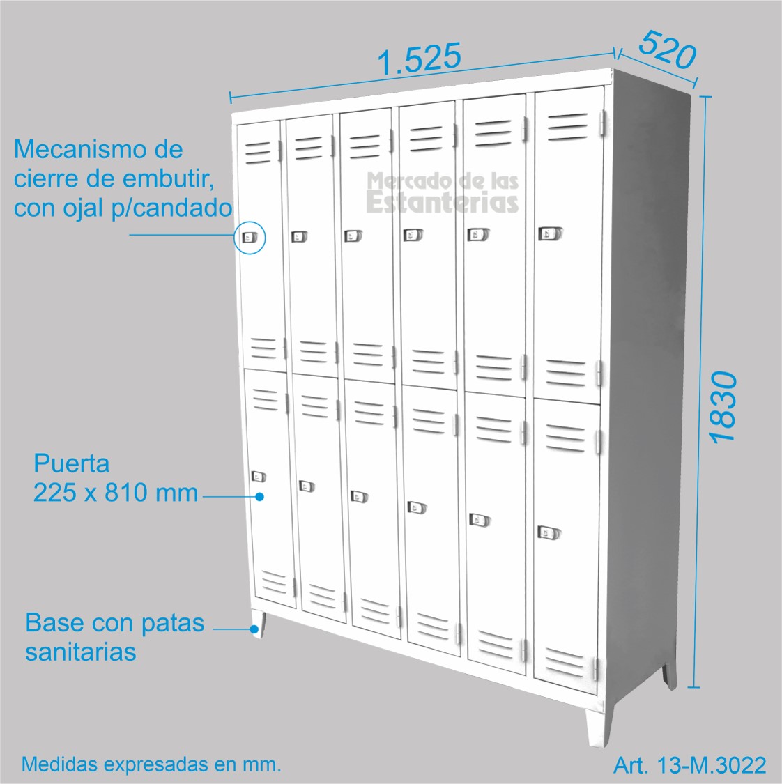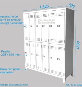 Cada compartimiento incluye barral para perchas, gancho perchero lateral, y puerta con doble rejilla de ventilación y manija embutida (evita enganches) con dispositivo para candado.