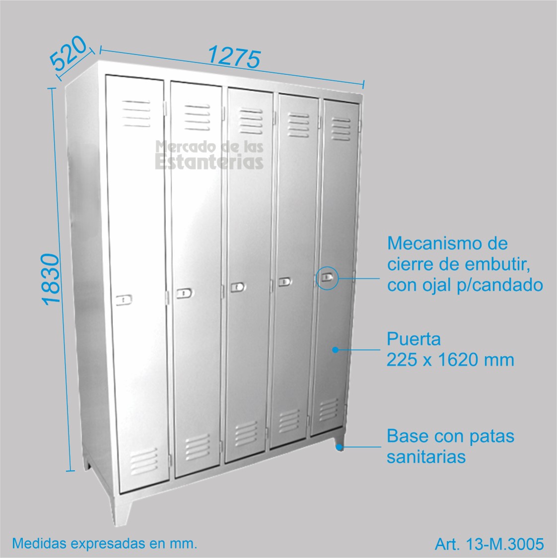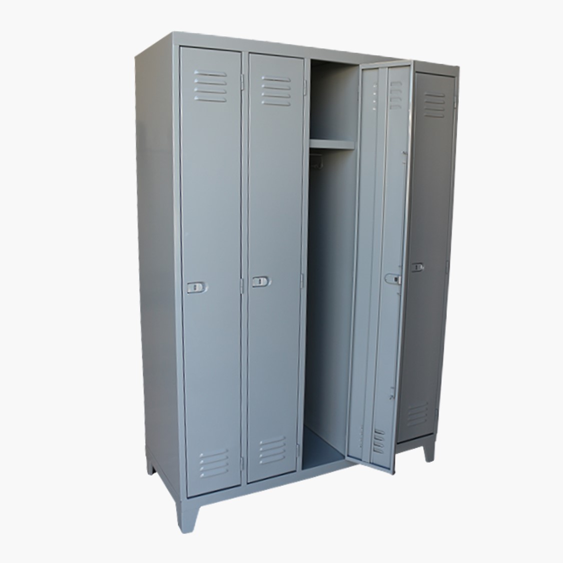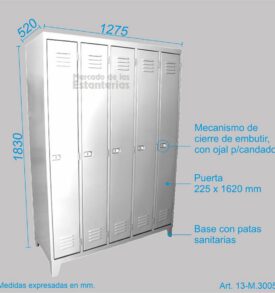 Cada compartimiento incluye 1 estante, barral para perchas, gancho perchero lateral, y puerta con doble rejilla de ventilación y manija embutida (evita enganches) con dispositivo para candado.