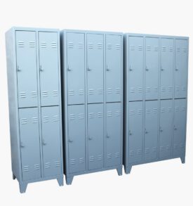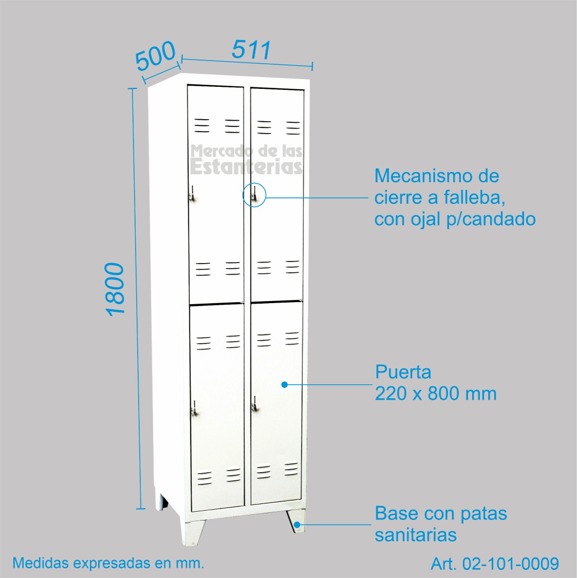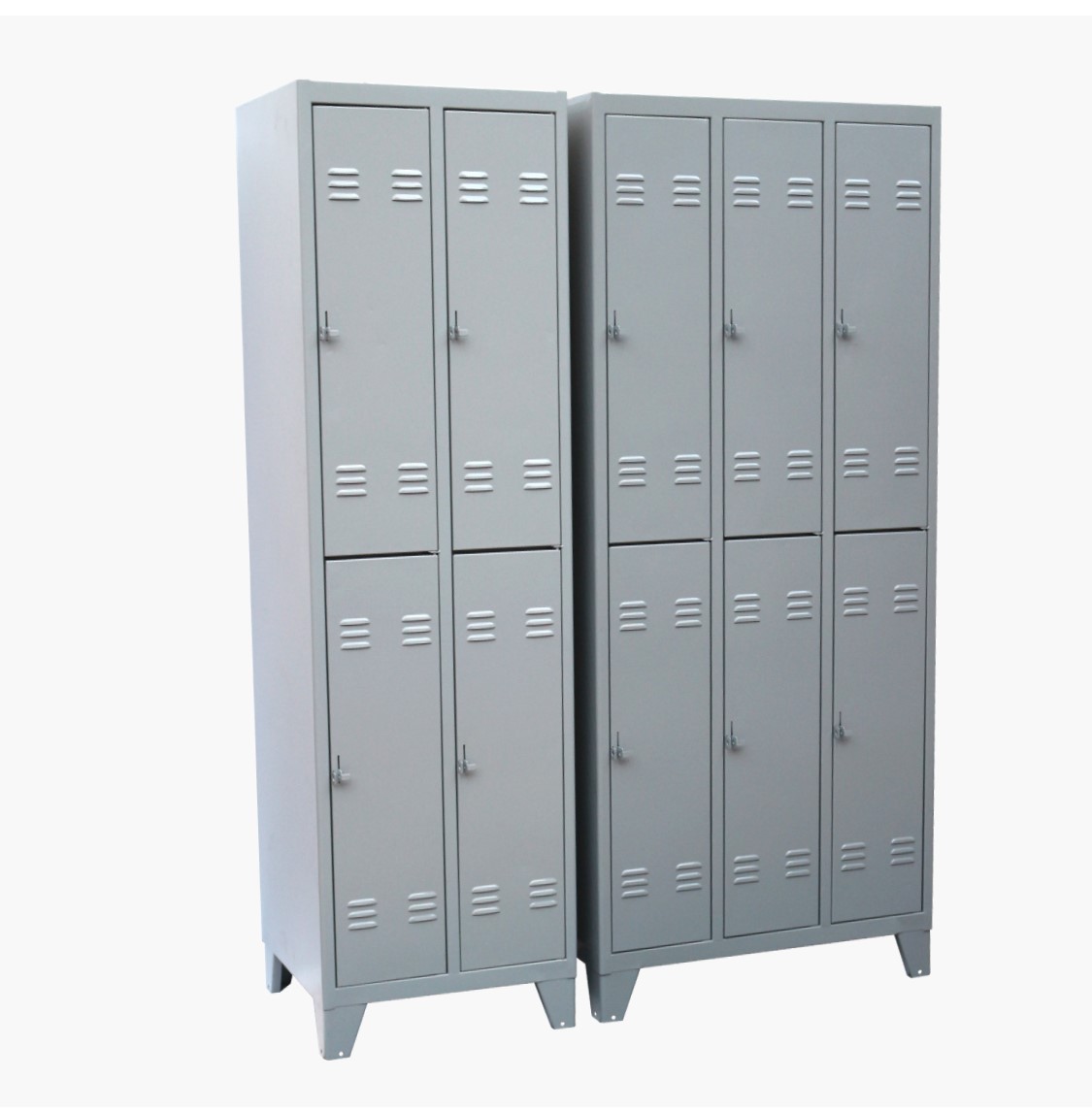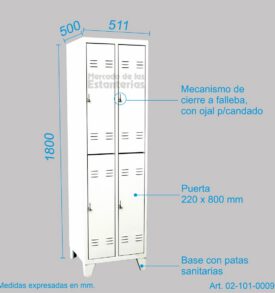 Cada compartimiento incluye, barral para perchas, gancho perchero lateral, y puerta con refuerzo interno, doble rejilla de ventilación y manija con dispositivo de cierre de fácil accionamiento y ojal para candado.