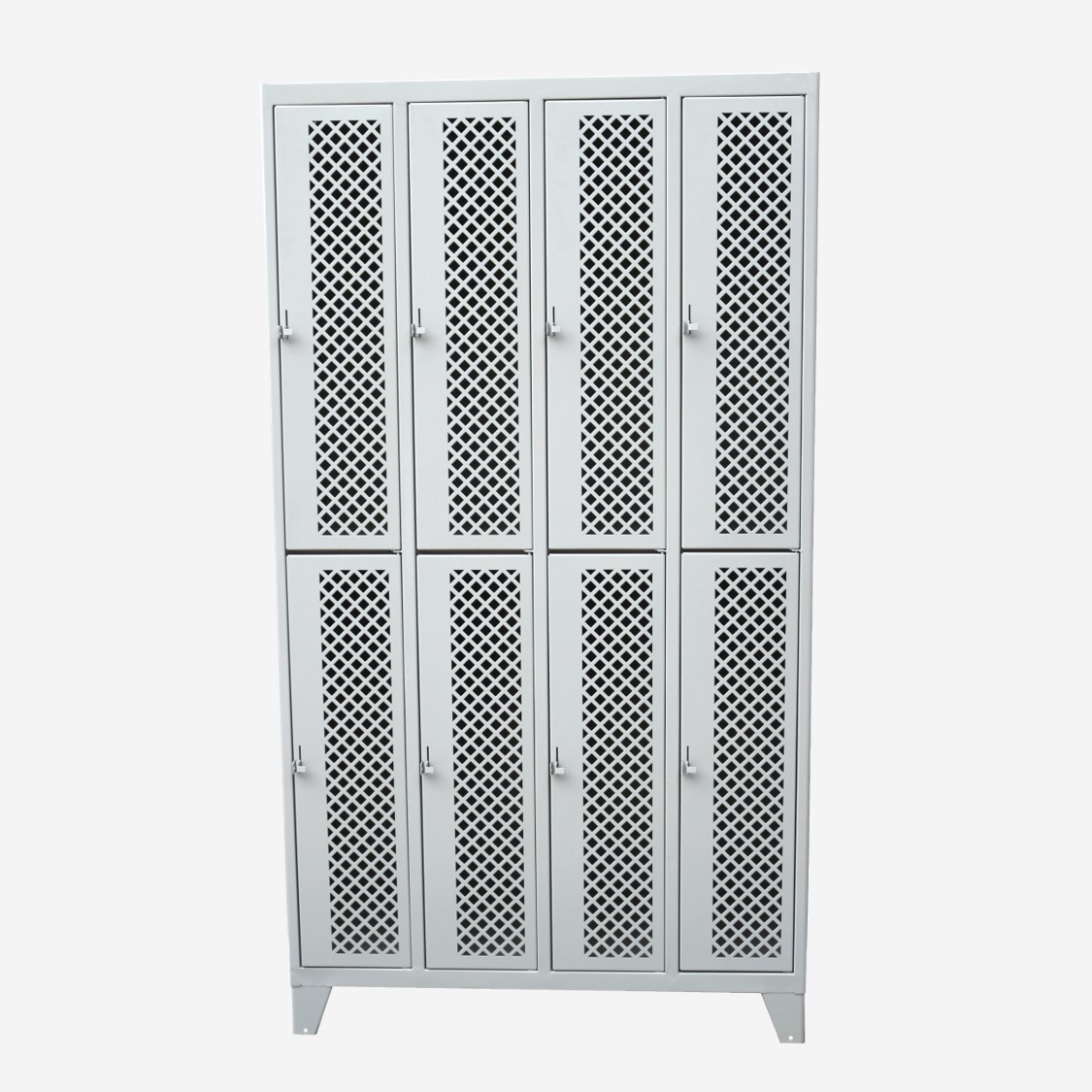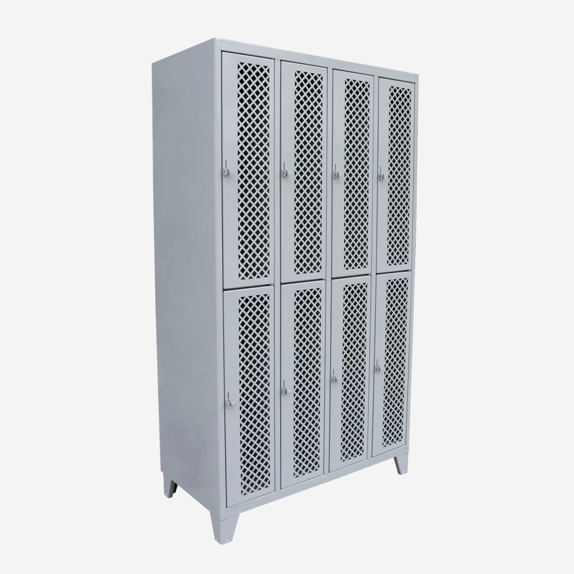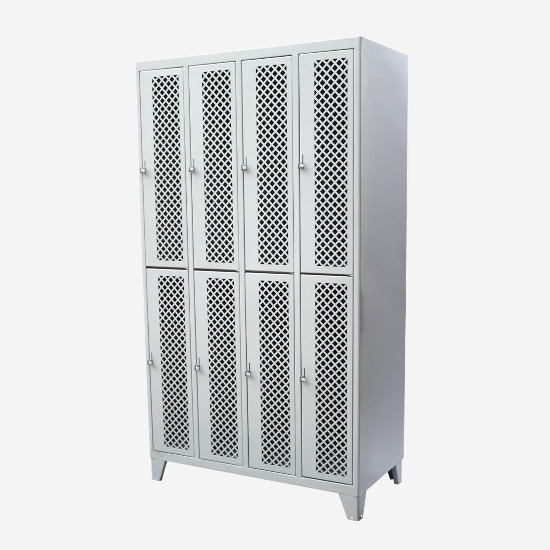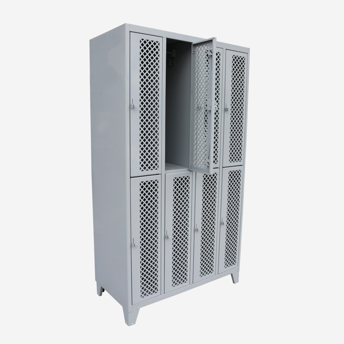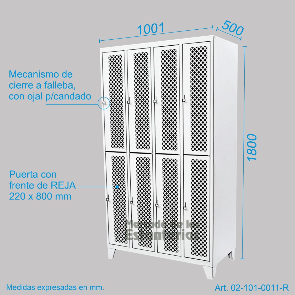 Cada compartimiento incluye, barral para perchas, gancho perchero lateral, y puerta con frente matrizado con perforaciones para permitir visualizar el interior y manija con dispositivo de cierre de fácil accionamiento y ojal para candado.
