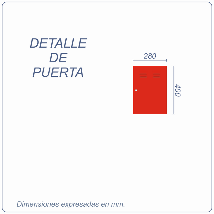 Terminación : pintura epóxi (en polvo) horneada a 180ºC previo tratamiento anticorrosivo. Color GRIS con puertas color ROJO.