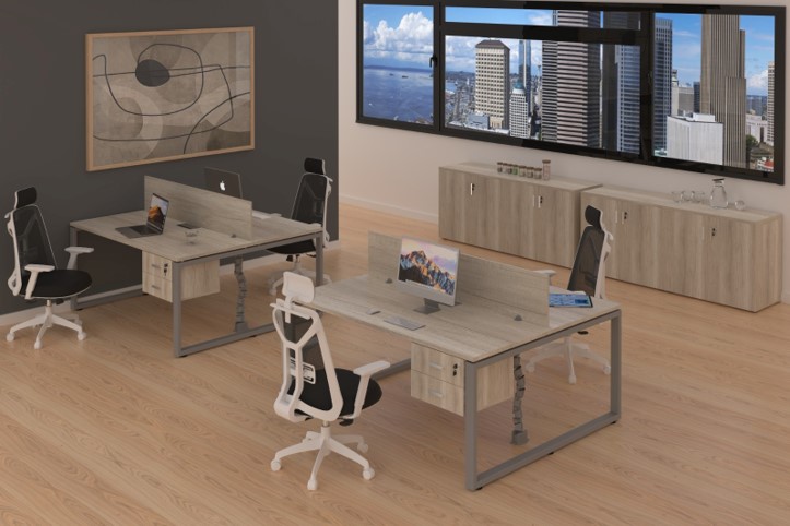 Puesto de Trabajo Doble línea RUPE, con planos de 1400x600mm. Incluye mampara divisoria, y 2 cajoneras flotantes 2 cajones con cerradura colectiva.