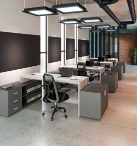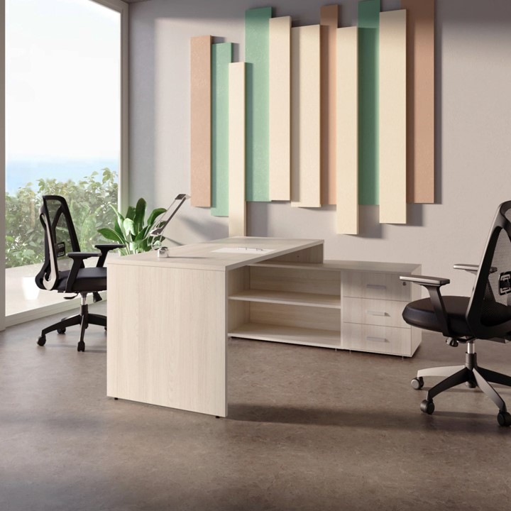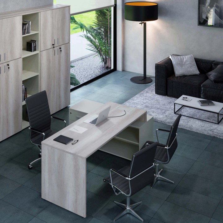 Puesto de Trabajo Simple en L, línea PIANI, con credenza de 1350mm. Incluye cajonera de 3 cajones con cerradura colectiva + módulo de guardado (puertas optativas). Disponible en lineas 18 / 21 / 25.
